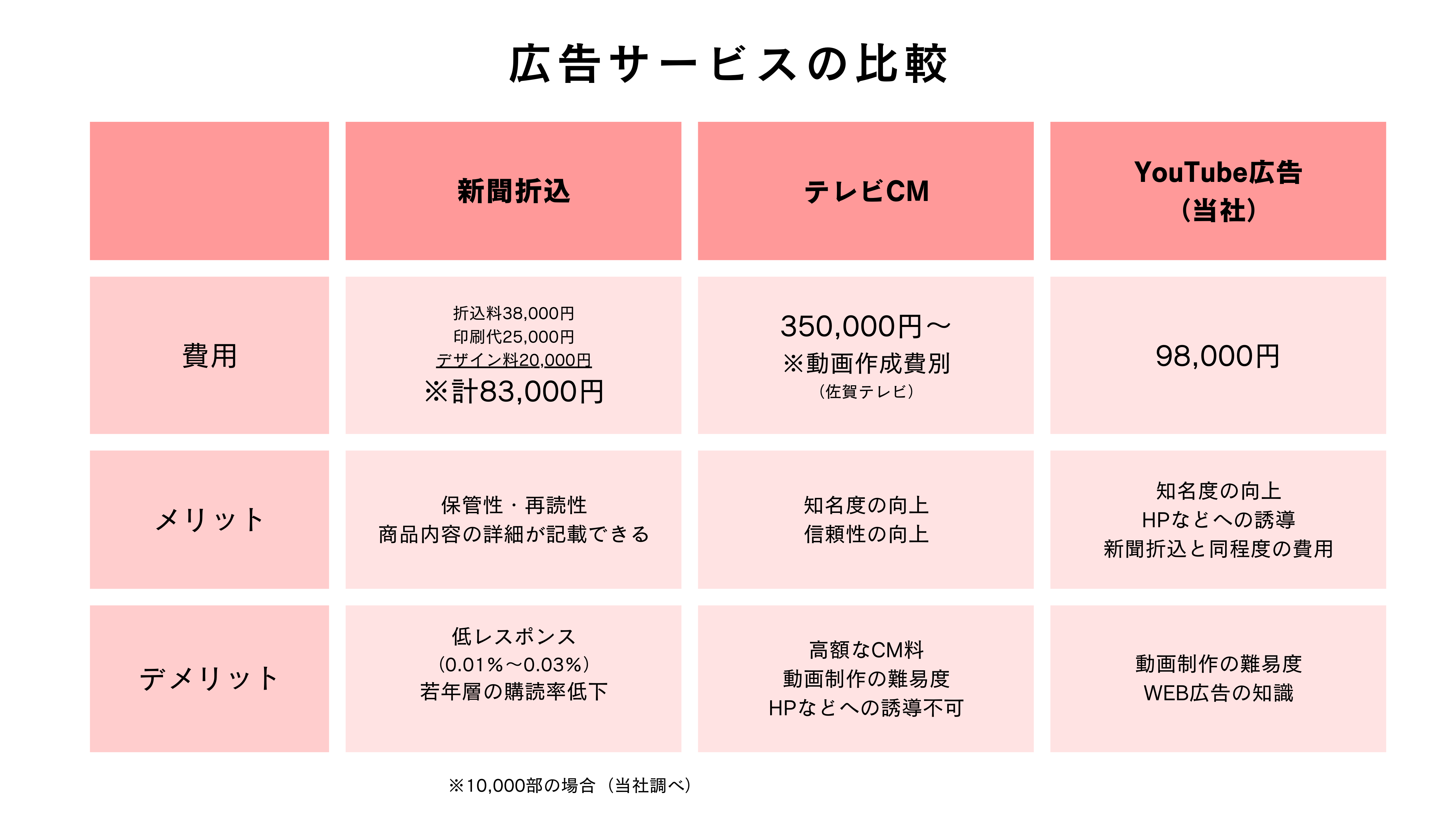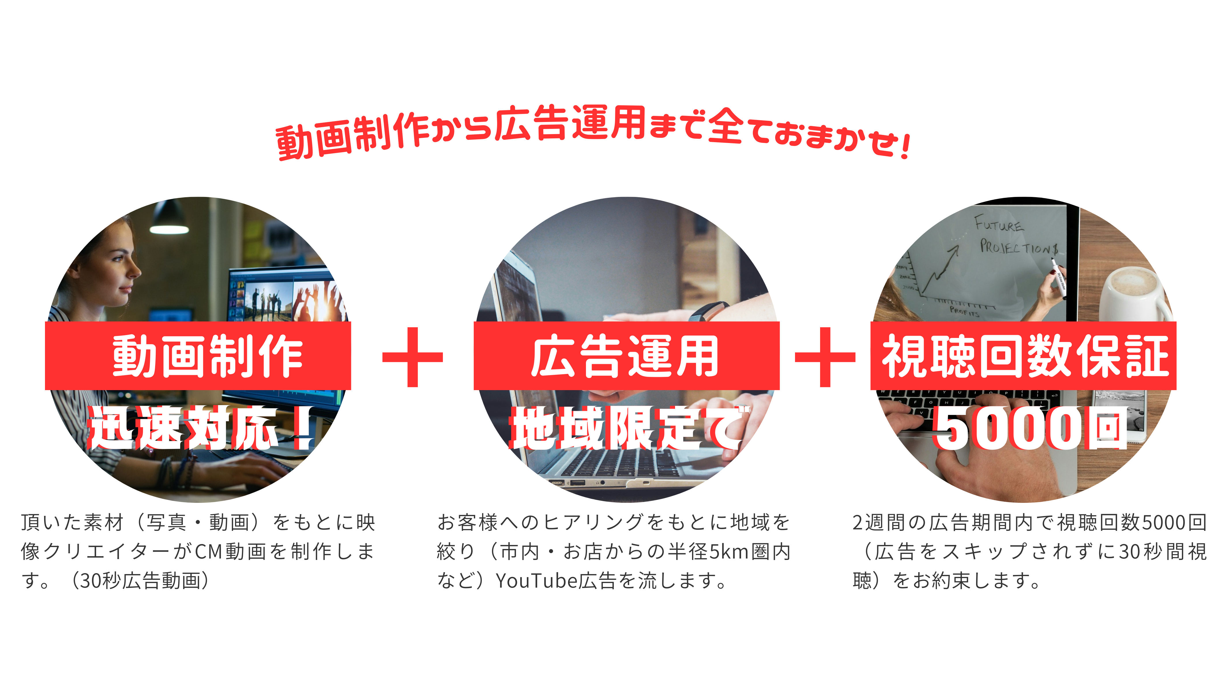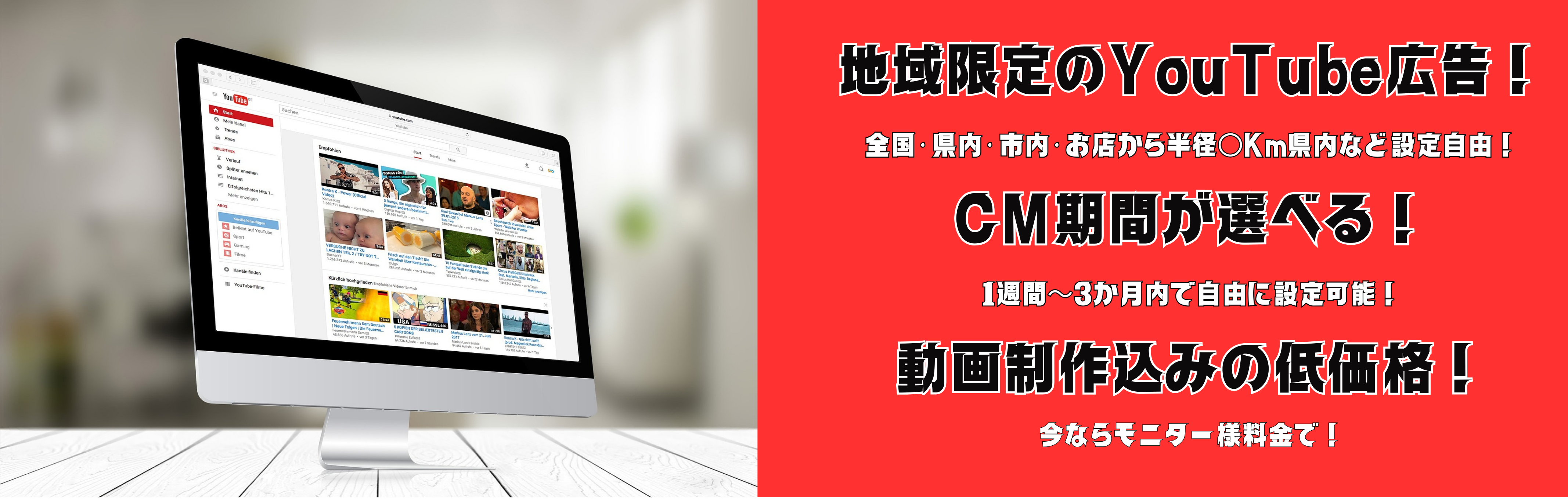 ホーム内容・料金制作実績事業概要アップロード HOME 2024.03.042025.05.20 エリアドウェブ広告では、YouTube広告の動画作成、CM運用サービスを提供しております。YouTubeを視聴する際に流れてくる動画CMを作成し放映するまでを一括でお任せいただけます。一般的に多額の費用が必要となる動画制作やCM放映ですが依頼者様から頂いた写真や映像をもとに動画CMを作成し地域を絞った放送をすることで低予算でCM放送できるサービスを実現しました。 放送する地域の絞り方は、全国の市単位以上であれば自由に設定できます。もちろん、県単位や全国単位でも設定可能です。また、依頼者様のお店から半径5Km圏内などの範囲設定も可能ですのでお店のターゲットとなる範囲に的を絞ることで無駄な放映費用を削減できます。放映期間も1週間~3ヶ月とお好みに合わせて調整可能です。 エリアドのYouTube広告の放送期間は、基本的に2週間とさせて頂いております。期間を短く設定し、短期間で多くの表示回数を目標にすることもできますし、放送期間を長くして長期間にわたり放送することもできます。YouTube動画広告は、5秒間でスキップすることができますがエリアドでは、スキップされずに30秒間最後まで視聴される回数を5,000回保証させていただきます。これは、スキップされる回数も含めた総表示回数で約10,000回~15,000回となります。 エリアドのYouTube動画CMのモニター様プランは、低予算で多くの視聴者に告知することができます。一般的に新聞折込は、低料金で広告できる方法ですが、レスポンスが0.01%~0.03%と言われています。YouTube動画CMは、YouTubeを視聴する際の始めや動画途中に表示されますので多くのレスポンスや企業・店舗の認知拡大が期待できます。しかし、動画制作の難易度が高く、専門的なWEB広告の知識が必要ですので高額な費用が必要となります。エリアドでは、動画制作から広告運用までを簡素化、システム化することで新聞折込と同程度の料金でYouTube動画CMを活用できるサービスを実現しました。 ↓お問い合わせはこちらから↓ 企業/店舗名(必須) 企業/店舗所在都道府県(必須) —以下から選択してください—北海道青森県岩手県宮城県秋田県山形県福島県茨城県栃木県群馬県埼玉県千葉県東京都神奈川県新潟県富山県石川県福井県山梨県長野県岐阜県静岡県愛知県三重県滋賀県京都府大阪府兵庫県奈良県和歌山県鳥取県島根県岡山県広島県山口県徳島県香川県愛媛県高知県福岡県佐賀県長崎県熊本県大分県宮崎県鹿児島県沖縄県 担当者様氏名(必須) お電話番号(必須) メールアドレス(必須) 作りたい広告動画の概要